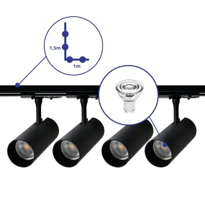 Beschreibung Komplettset 1-Phasen Rail L 1 x 1,5 Meter Schwarz | incl. 4x Spot + GU10 2700K 3W Dimmbar + Abschlusskappe, Stromanschluss und L -Verbinder