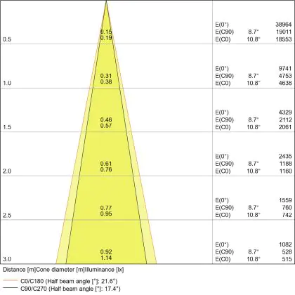 Beispiel: Wird eine Lampe mit einem Abstrahlwinkel von 60 Grad an der Decke (2,5 m Höhe) angebracht, erzeugt sie einen Lichtkegel von 2,9 Metern Durchmesser. Hat die Lampe hingegen einen Abstrahlwinkel von 120 Grad, beträgt der Lichtkegel 8,7 Meter im Durchmesser. |