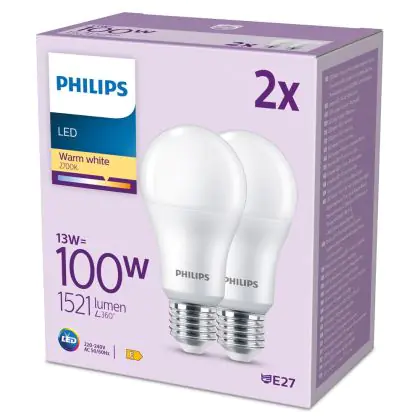 Die Mehrfachpackung 2x Philips Glühbirne LED E27 Birne Matt 13W 1521lm - 827 Extra Warmweiß ist eine effiziente E27 LED-Lampe und der perfekte Ersatz für Ihre konventionellen W Lampen mit E27-Sockel. Zudem strahlt sie Licht in der Farbtemperatur 2700K - Extra Warmweiß aus und punktet durch eine lange Lebensdauer.
