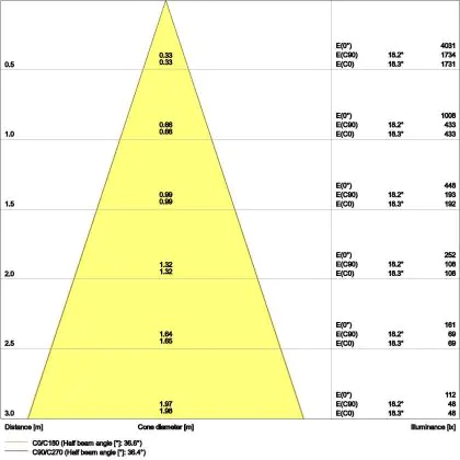 Beispiel: Wird eine Lampe mit einem Abstrahlwinkel von 60 Grad an der Decke (2,5 m Höhe) angebracht, erzeugt sie einen Lichtkegel von 2,9 Metern Durchmesser. Hat die Lampe hingegen einen Abstrahlwinkel von 120 Grad, beträgt der Lichtkegel 8,7 Meter im Durchmesser. |