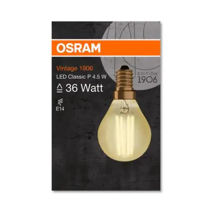 Die Osram Vintage 1906 LED E14 P45 4.5W 825 Gold | Ersetzt 36W ermöglicht enorme Energieeinsparungen von bis zu 90 %. Dank des Standard-E14-Sockels klappt der Umstieg auf LED besonders einfach. Die Goldbeschichtung und die sichtbaren Filamentstäbe im Inneren des Leuchtkörpers machen die Vintage-LED zu einem echten Highlight.