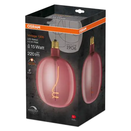 Die Osram Vintage 1906 LED E27 Special Filament Colored 4.5W 220lm - 816 Extra Warm White | Dimmable ist eine effiziente E27 LED-Lampe mit Retrodesign und der perfekte Ersatz für Ihre konventionellen 15W Lampen mit E27. Zudem strahlt sie Licht in der Farbtemperatur 1600K - Extra Warmweiß aus und punktet durch eine lange Lebensdauer.